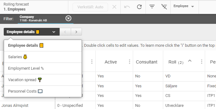 - Go through the different tabs and start planning for each employee. Check that you have salary, employment level and vacation days filled in.