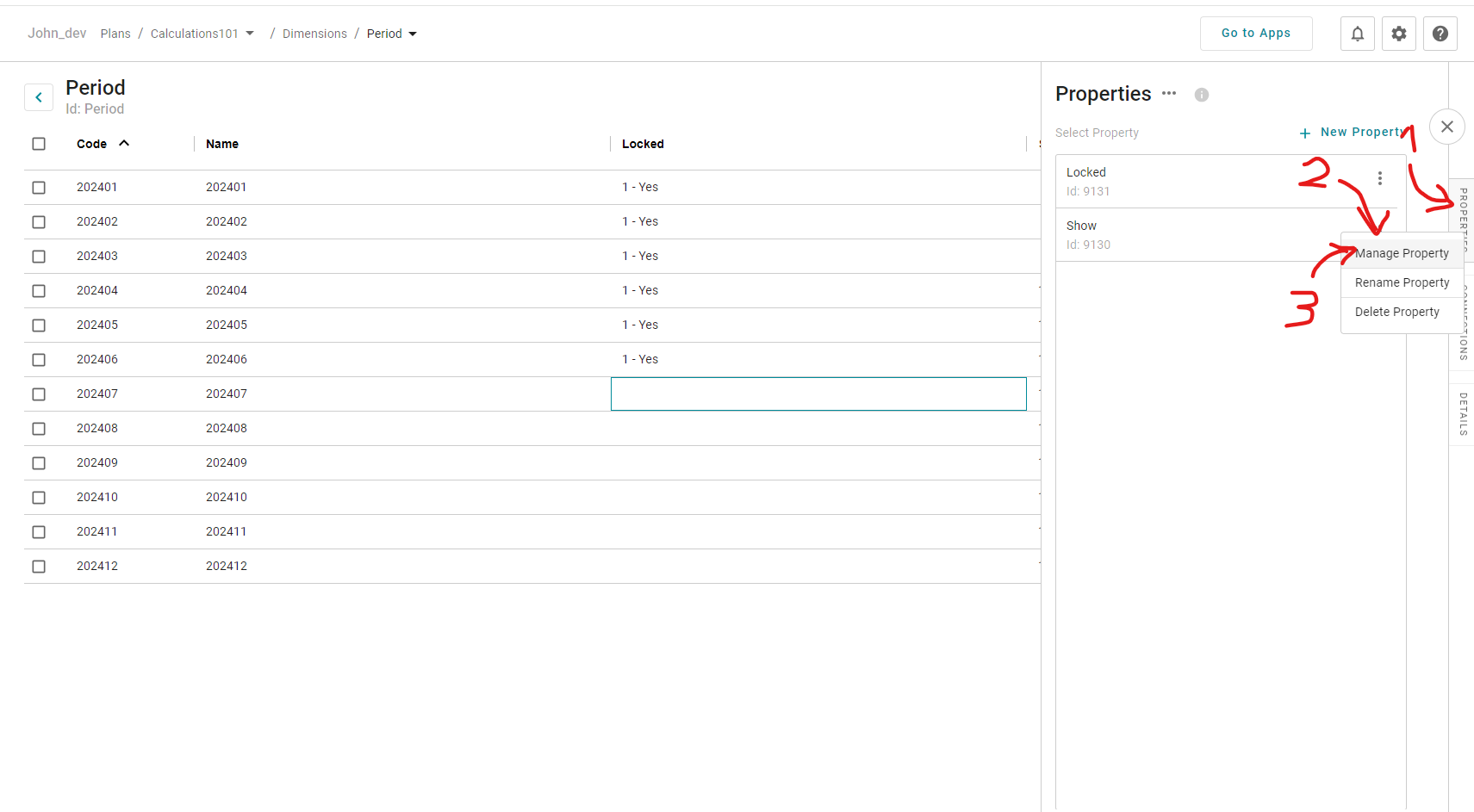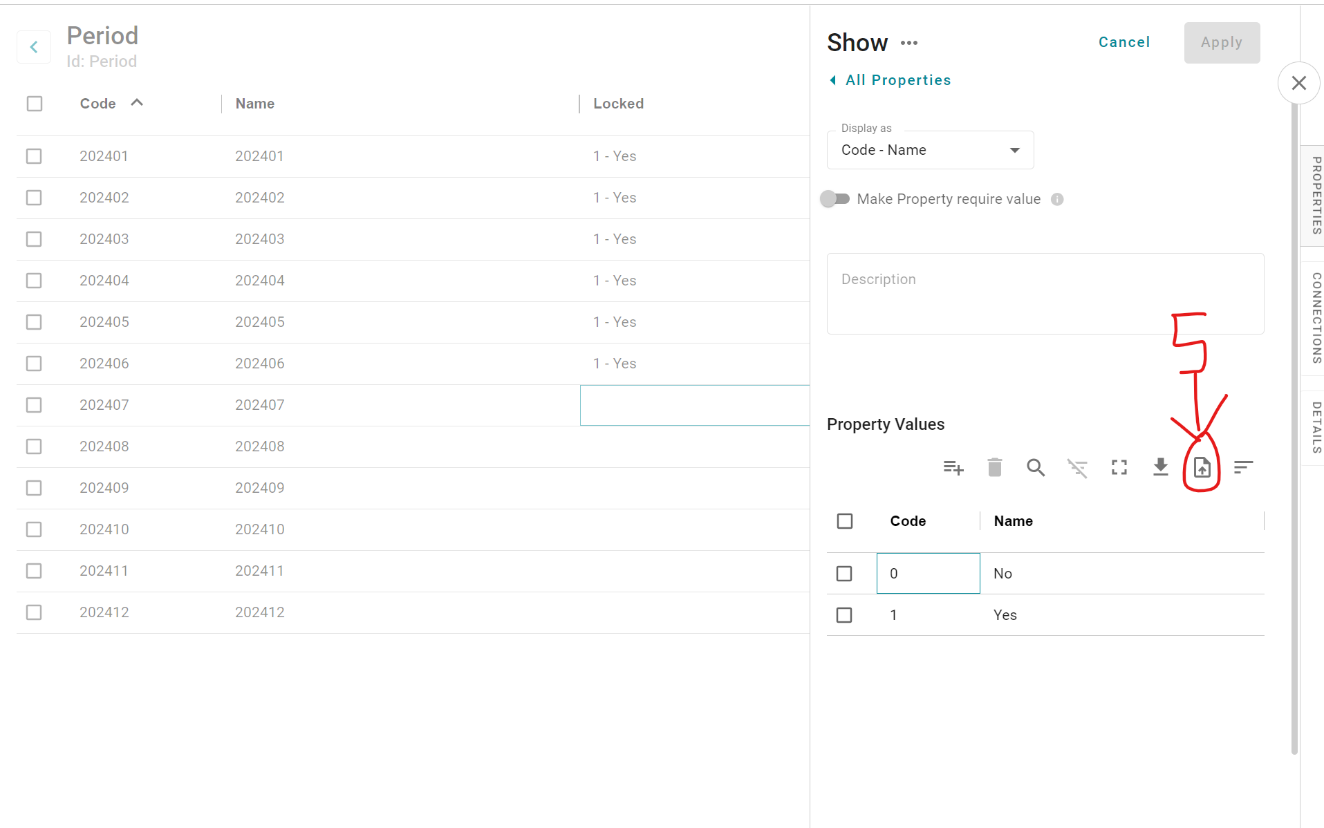 Properties (like Dimensions) have Code and Name. However, they cannot have properties themselves and cannot be used directly in Valuetypes. Also, Properties are unique per Dimension and not shared between Dimensions. Property values can be imported via file (see steps in the images below). The file only need Code and Name.
